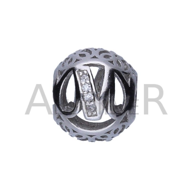 Der durchbrochene Anhänger passt zu einem modularen Perlenarmband mit einem Durchmesser von 3 mm, 925er Silber, rhodiniert, weißer Zirkon, Buchstabe M.