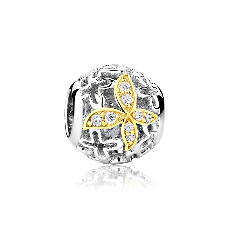 Durchbrochener Anhänger für ein Perlenarmband, Durchmesser 3 mm, Kombination aus 925er Silber, rhodiniert mit 24 Karat vergoldetem, weißem Zirkon, Schmetterling.