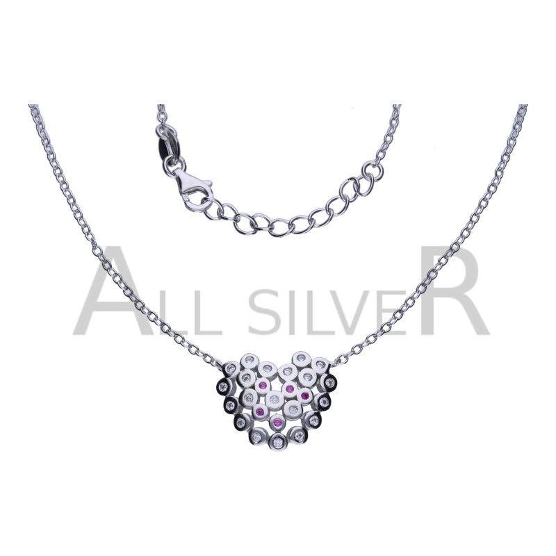 HALSKETTE, 925 SILBER, RHODINIERT, LÄNGE 41 CM + 3 CM VERLÄNGERUNG, WEISSER UND ROSA ZIRKONIA, HERZ.
