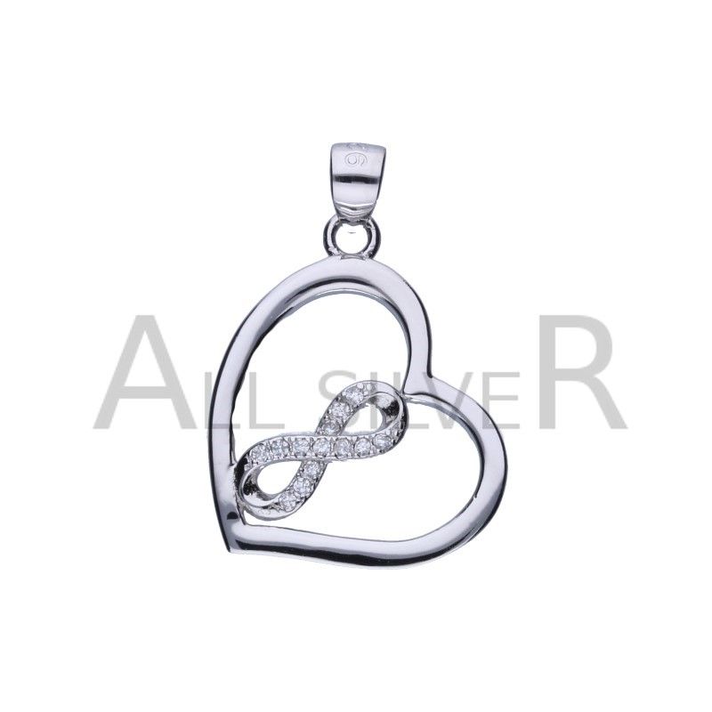 ANHÄNGER AUS 925er SILBER, RHODINIERT, ABMESSUNGEN OHNE BAND 18 MM X 18 MM, WEISSER ZIRKONIA, HERZ, UNENDLICH.