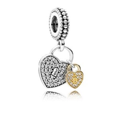 DOPPELPERLENANHÄNGER, GEEIGNET FÜR MODULARE ARMBÄNDER MIT EINEM DURCHMESSER VON 3 MM, 925 SILBER, RHODINIERT UND VERGOLDET MIT 24 KARAT GOLD, WEISSEM ZIRKONIA, HERZEN MIT SCHLÜSSEL, VORHÄNGESCHLOSS.