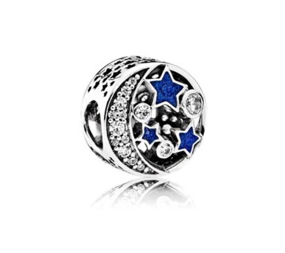 Der Anhänger passt zu modularen Perlenarmbändern mit einem Durchmesser von 3 mm, 925er Silber, rhodiniert, weißer Zirkon und blaue Emaille, Sterne, Mond, Nacht.