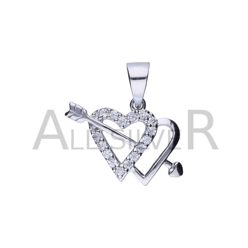ANHÄNGER, 925 SILBER, RHODINIERT, HÖHE OHNE KRAWATTE 1,2 CM, WEISSE ZIRKONIEN, HERZEN, durchbohrt von einem PFEIL.