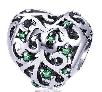 Durchbrochener Anhänger für ein modulares Perlenarmband, 3 mm Durchmesser, 925er Silber, rhodiniert, grüner Zirkon, Herz.