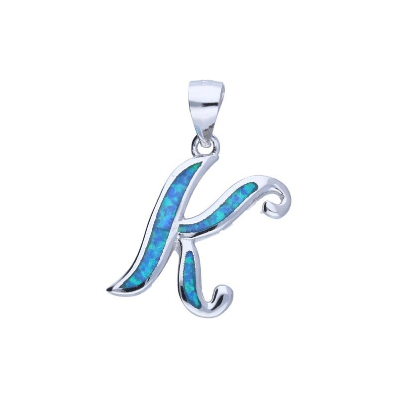 ANHÄNGER AUS 925er SILBER, RHODINIERT, HANDPOLIERT, ABMESSUNGEN OHNE KRAWATTE 1,2 CM X 1,7 CM, BUCHSTABE K, BLAUER OPAL.