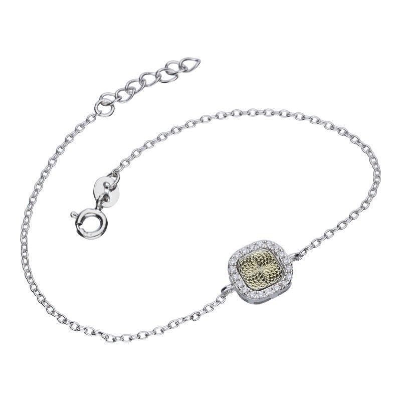 ARMBAND, KOMBINATION AUS 925 SILBER RHODIUM UND VERGOLDET, LÄNGE 16 cm + 3 cm VERLÄNGERUNG, WEISSES ZIRKONIA, DIAMANTZENTRUM MIT 3D-EFFEKT.
