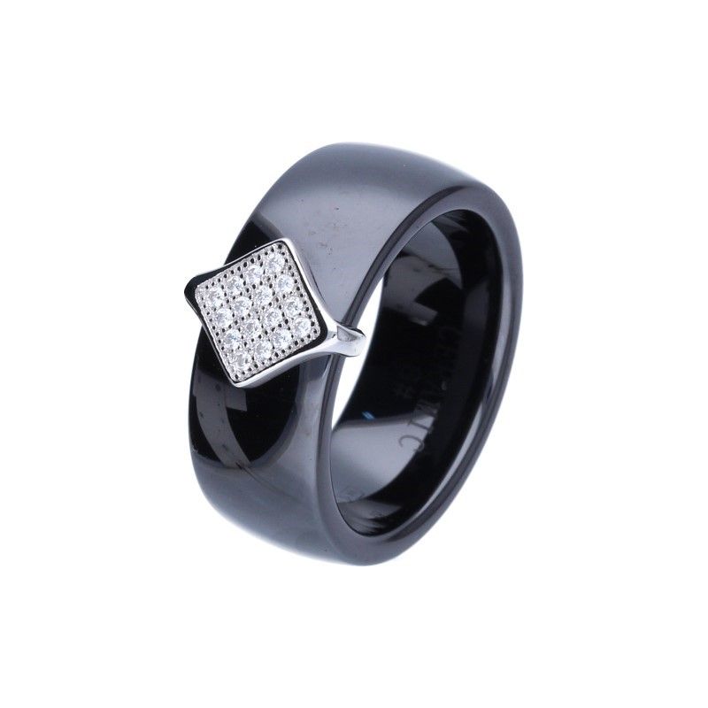 RING AUS SCHWARZER GLATTER KERAMIK, 925ER SILBER, RHODIUMBESCHICHTET, WEISSER ZIRKONIA, BREITE 8 mm.