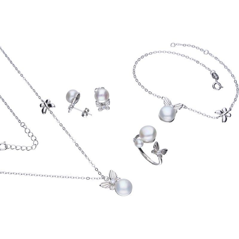 SET HALSKETTE, OHRRINGE, ARMBAND PLUS RING, 925 SILBER RHODINIERT, WEISSE PERLEN UND ZIRKONIA, SCHMETTERLING, LÄNGE 42CM+3CM, 18CM+2CM.