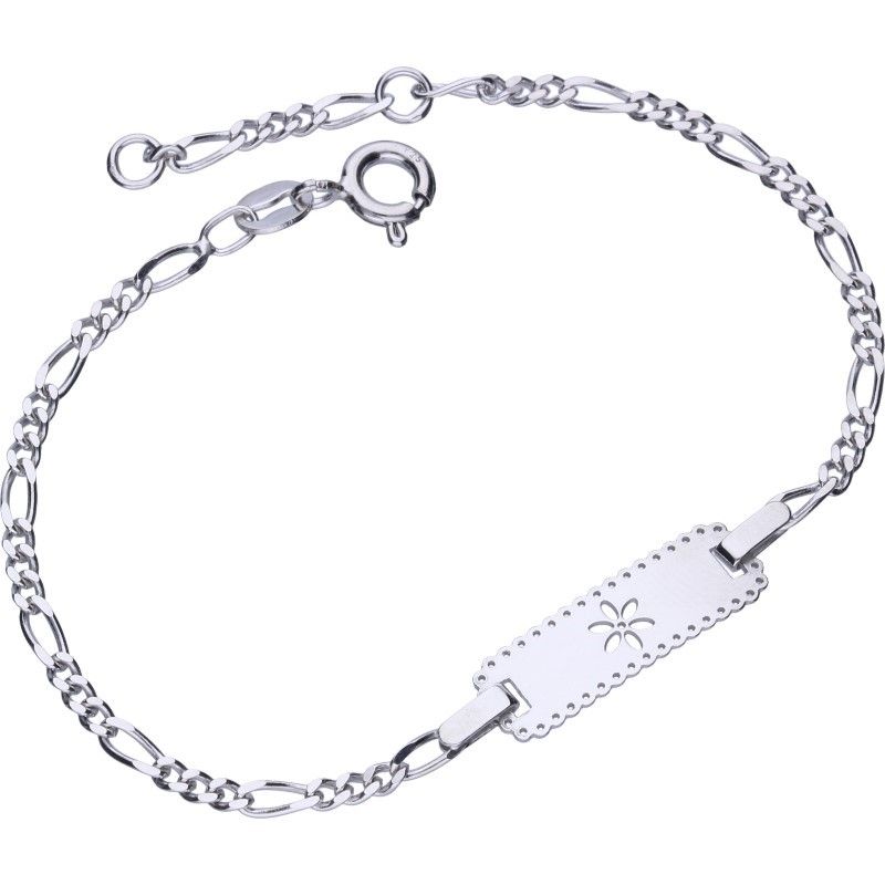 KINDERARMBAND AN FIGARO-KETTE, 925 SILBER, RHODINIERT, LÄNGE 15 cm, LÄNGSPLATTE MIT AUSGESCHNITTENER BLUME, GRÖSSE 15 mm x 5 mm.