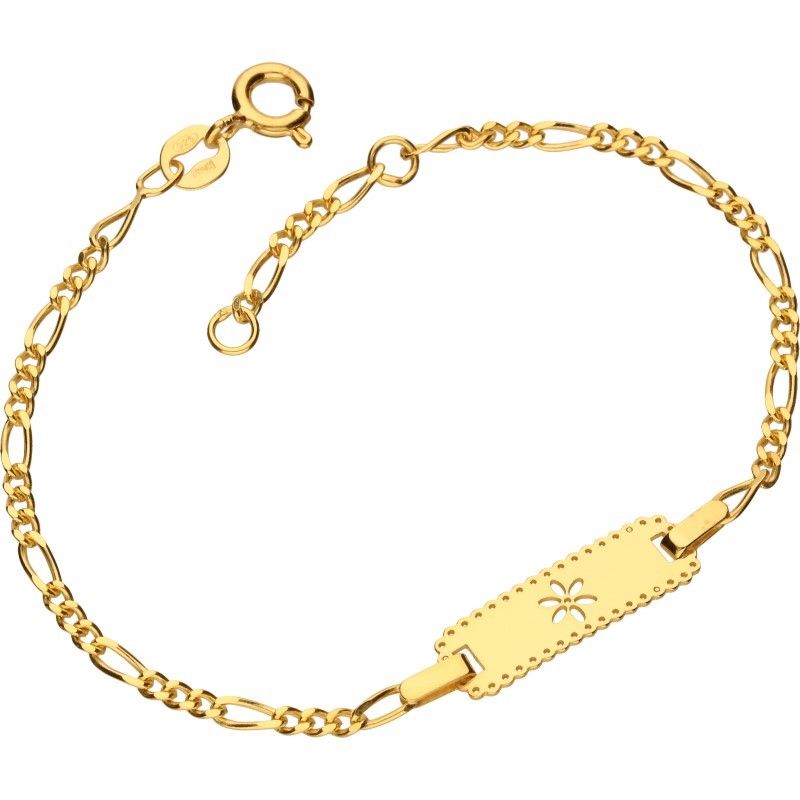 KINDERARMBAND AN FIGARO-KETTE, 925 SILBER, VERGOLDET MIT 24 KARAT GOLD, LÄNGE 15 cm, LÄNGSPLATTE MIT AUSGESCHNITTENER BLUME, GRÖSSE 15 mm X 5 mm.