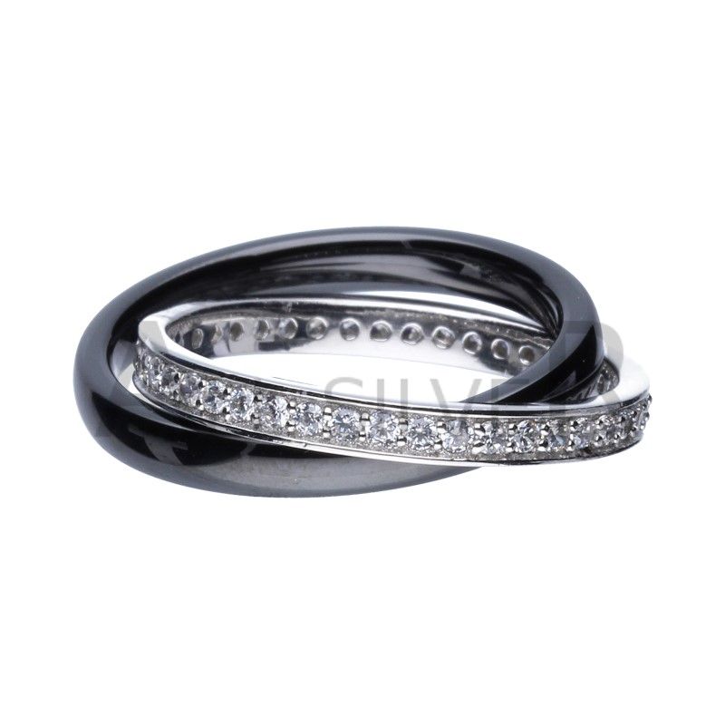RING, SCHWARZE GLATTE KERAMIK, RHODINIERTES SILBER, WEISSER ZIRKONIA-RING, BESTEHEND AUS ZWEI ELEMENTEN.