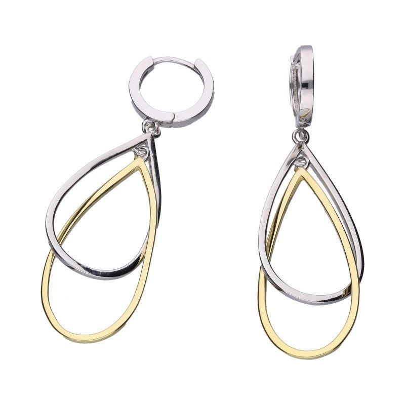 OHRRINGE AN EINEM RING MIT EINEM DURCHMESSER VON 13 mm, EINE KOMBINATION AUS 925er SILBER, RHODINIERT MIT 24 KARAT VERGOLDET, MANDELN, TRÄNEN, ABMESSUNGEN 30 mm X 16 mm UND 34 mm X 16 mm.