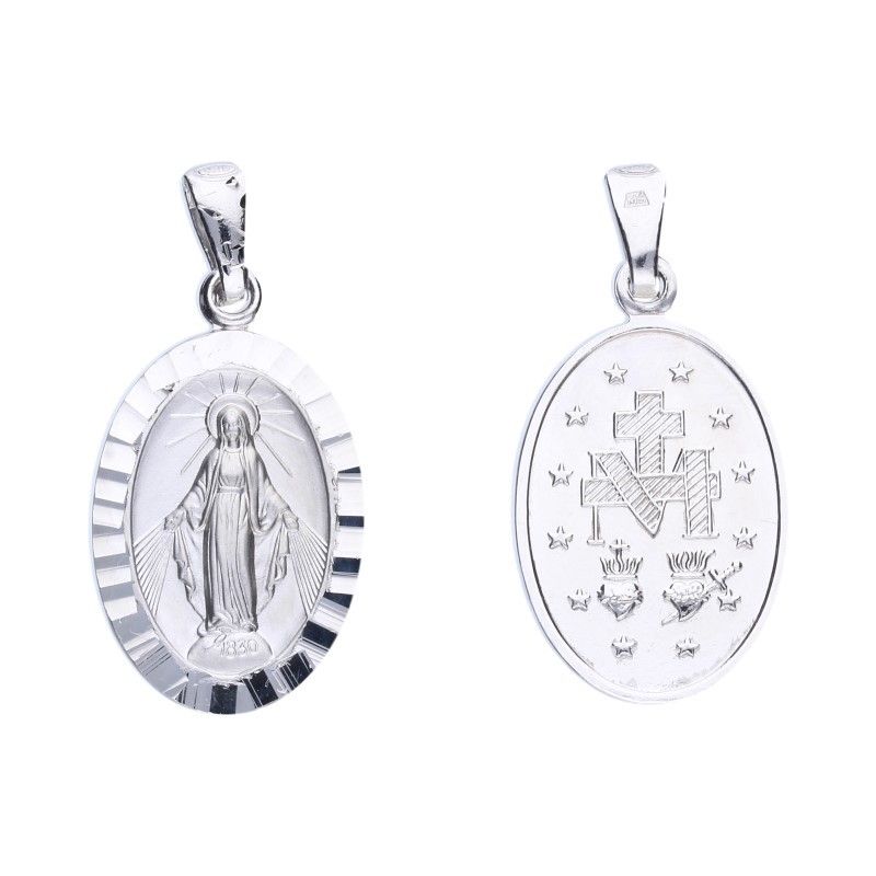 DOPPELSEITIGES WUNDERMEDALIT, 925 SILBER RHODINIERT, DIAMANTRAND, ABMESSUNGEN OHNE BAND 23 mm X 16 mm, OVAL.