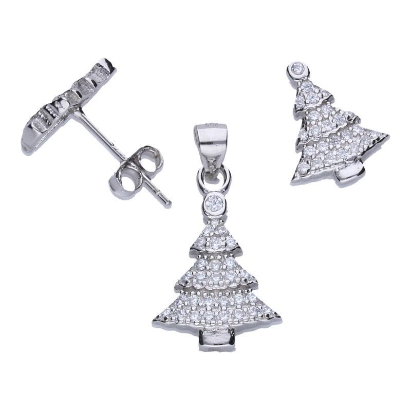 ZARTES SET, ANHÄNGER UND OHRRINGE, 925 SILBER RHODINIERT, WEISSER ZIRKONIA, WEIHNACHTSMOTIV, WEIHNACHTSBAUM.