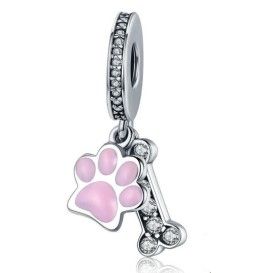 DOPPELTER ANHÄNGER PASST ZU MODULAREN PERLENARMBÄNDERN MIT EINEM DURCHMESSER VON 3 MM, 925er SILBER, RHODIUMBESCHICHTET, WEISSER ZIRKONIA, ROSA EMAILLE, KNOCHEN, HUNDEPFOTE.