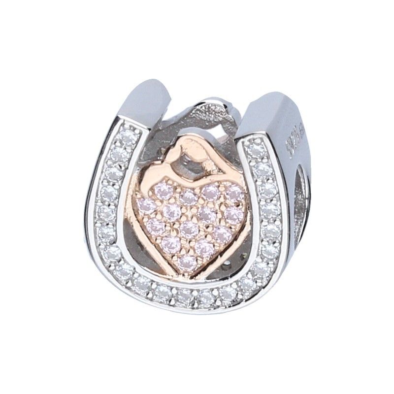 PERLENANHÄNGER GEEIGNET FÜR MODULARE ARMBÄNDER MIT EINEM DURCHMESSER VON 3 MM, 925 SILBER, RHODIUM UND ROSA VERGOLDET, WEISSER ZIRKONIA, HUFEISEN UND HERZ, GLÜCK IN DER LIEBE.