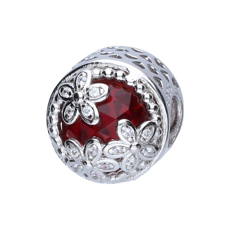 MODULARER ARMBANDANHÄNGER IN PERLENFORM, DURCHMESSER 3 MM, 925 SILBER, RHODIUMBESCHICHTET, WEISSER ZIRKONIA PLUS FACETTIERTER RUBIN-KLON-STEIN, BLUMEN.