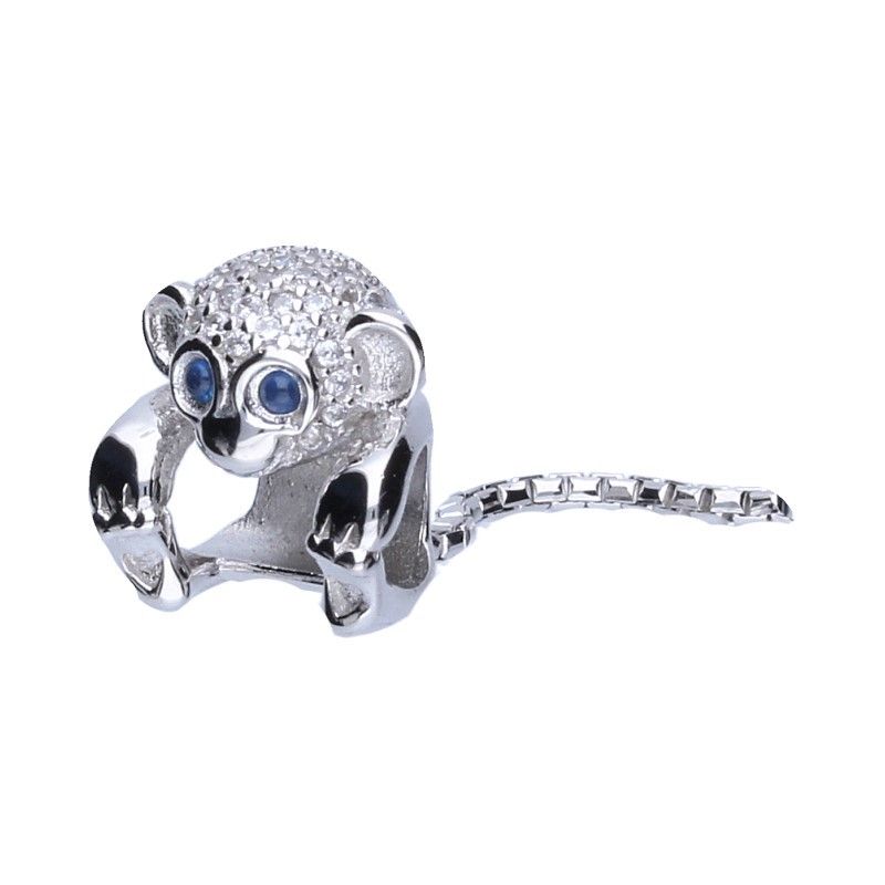 LUSTIGER ARMBANDANHÄNGER, GLÜCKLICHER AFFE MIT HÄNGENDEM SCHWANZ UND BLAUEN AUGEN, 925 SILBER, RHODINIERT, WEISSER ZIRKONIA. Passend für modulare Standardarmbänder mit einem Durchmesser von 3 mm. ABMESSUNGEN 11MMX10MM + 17MM-HECK.