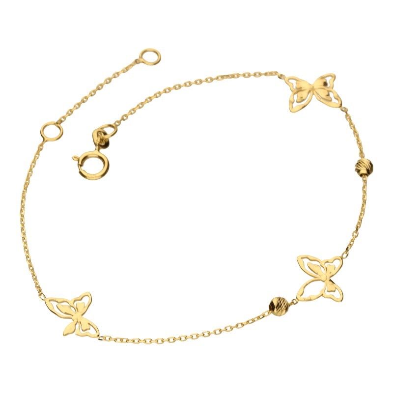 ARMBAND MIT DIAMANTKUGELN, DURCHMESSER 2mm, 585 GOLD, LÄNGE 19cm + 2cm VERLÄNGERUNG, ANKERKETTE, DREI SCHMETTERLINGE, ABMESSUNGEN 8mm X 7mm, 14K.