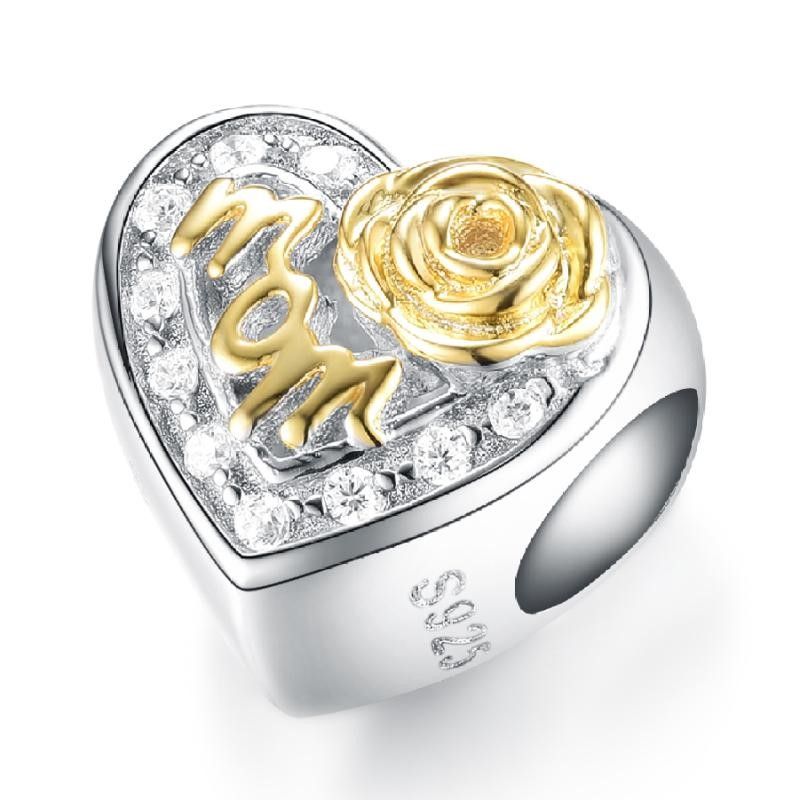 PERLEN-ARMBANDANHÄNGER, DURCHMESSER 3 MM, KOMBINATION AUS 925er SILBER, RHODINIERT MIT 24 KARAT VERGOLDET, WEISSEM ZIRKONIA, HERZ MIT DER ANLEITUNG MOM PLUS ROSE.