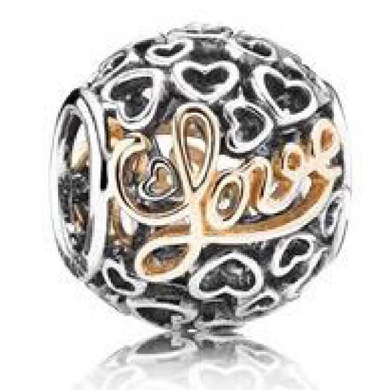 Durchbrochener Perlenanhänger, passend für modulare Armbänder mit einem Durchmesser von 3 mm, 925er Silber, rhodiniert und vergoldet mit 24 Karat Gold, Herzen, Liebe.