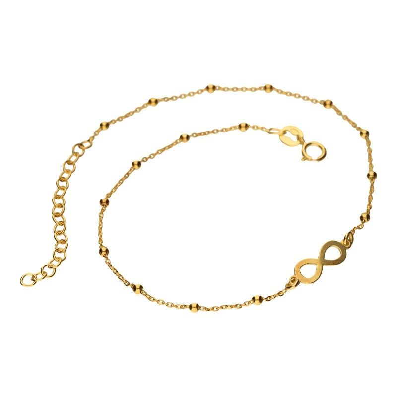 BEINARMBAND, 925er SILBER, 24 KARAT VERGOLDET, LÄNGE 23CM + 4CM VERLÄNGERUNG, ANKER MIT GLATTEN KUGELN PLUS INFINITY.