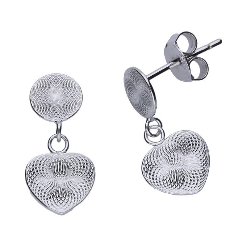 Filigrane Hängeohrstecker, 925er Silber rhodiniert, Ring und hängendes Herz, beide Elemente mit 3D-Effekt, Herzgröße: 8 mm x 8 mm, Ringdurchmesser 6 mm. Zur Vervollständigung des Sets liefern wir ein Armband mit dem Symbol: B-01429(HT8X8).