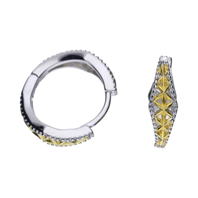 Creolen, 925er Silber, rhodiniert und teilweise mit 24 Karat Gold vergoldet, zartes durchbrochenes Muster, Ringgröße: 17 mm x 17 mm.