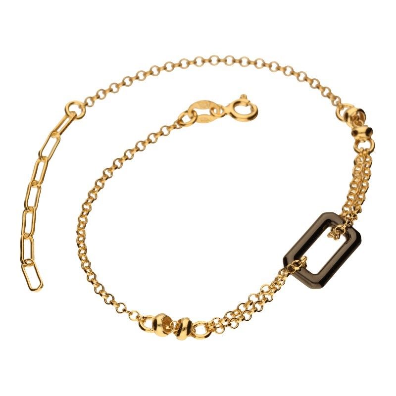 ARMBAND AUS 925ER SILBER, VERGOLDET MIT 24 KARAT GOLD, LÄNGE 18 CM + 3 CM VERLÄNGERUNG, SCHWARZES KERAMIKELEMENT IN RECHTECKFORM, ABMESSUNGEN 13 MM X 8 MM, ROLLO-KETTE.
