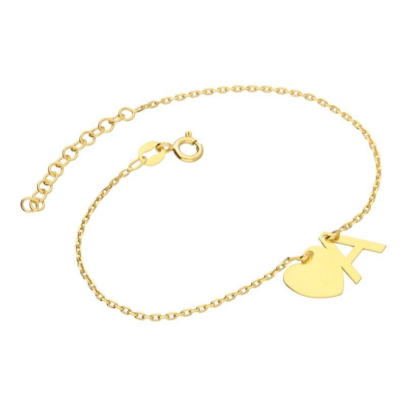 Armband aus 925er Silber, vergoldet mit 24 Karat Gold, Länge 17 cm + Verlängerung 3 cm, glattes Herz und der Buchstabe A.