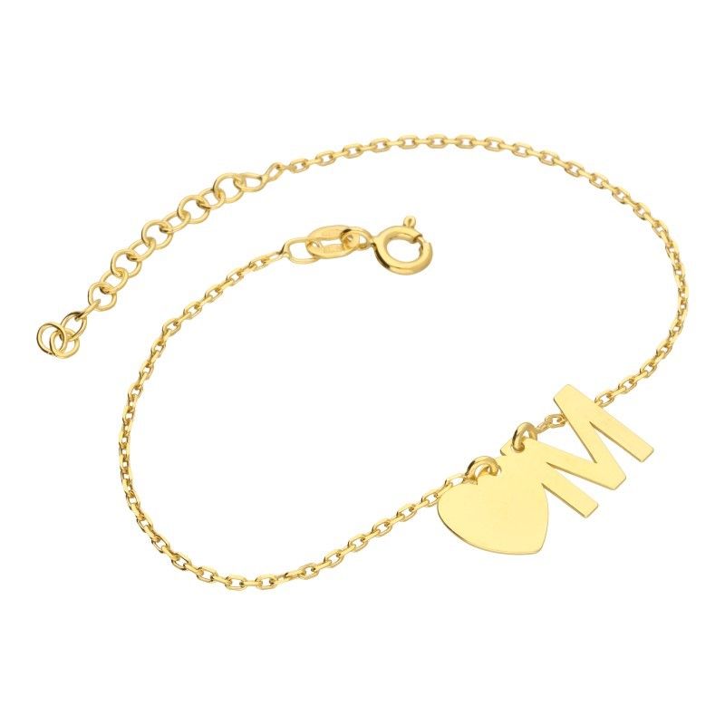 Armband aus 925er Silber, vergoldet mit 24 Karat Gold, Länge 17 cm + Verlängerung 3 cm, glattes Herz und der Buchstabe M.