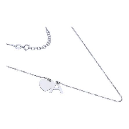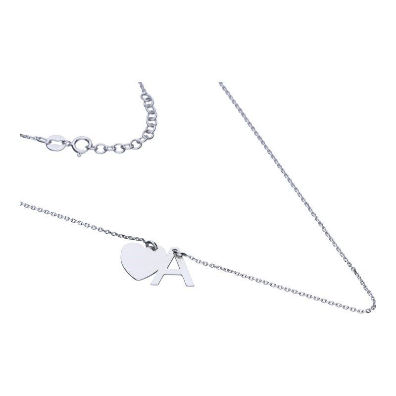 HALSKETTE AUS SILBER 925, RHODIUMBESCHICHTET, LÄNGE 42 CM + 3 CM VERLÄNGERUNG, GLATTES HERZ UND DER BUCHSTABE A.