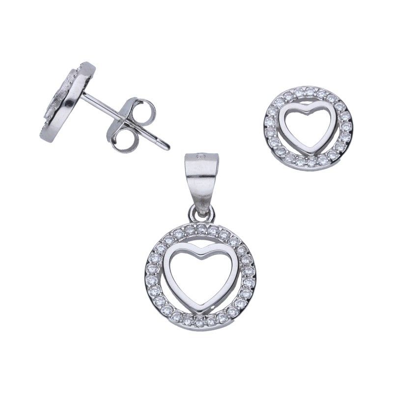 SET AUS OHRSTECKER PLUS ANHÄNGER, 925 SILBER RHODINIERT, WEISSER ZIRKONIA, HERZ, ANHÄNGERDURCHMESSER 11 mm.