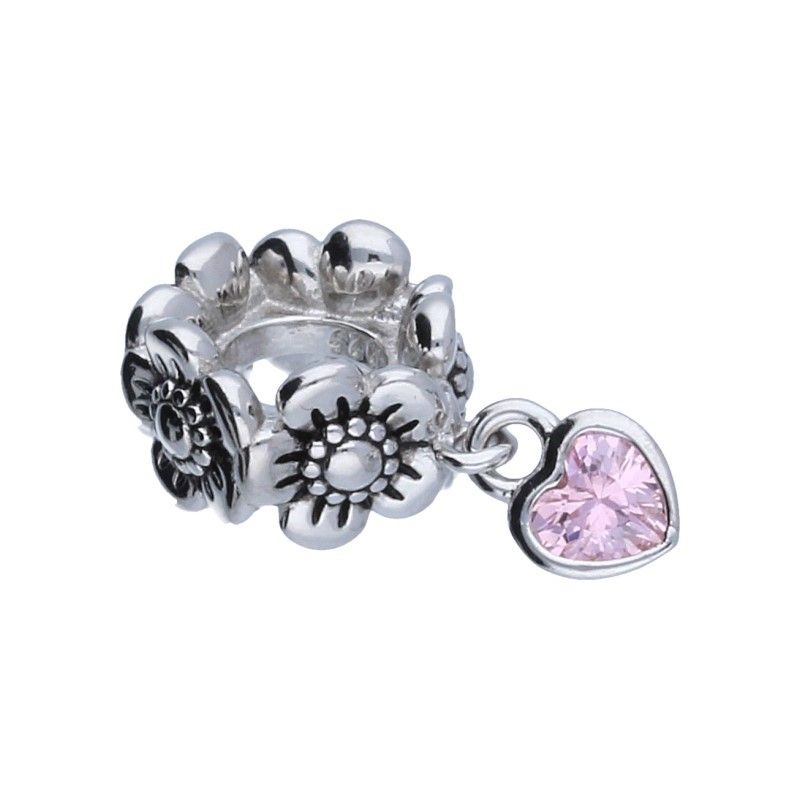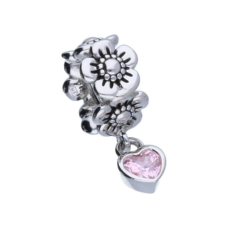 PERLENANHÄNGER PASST ZU MODULARARMBÄNDERN MIT EINEM DURCHMESSER VON 3 MM, 925 SILBER, RHODINIERT, ROSA ZIRKONIA, HERZ, BLUMEN.