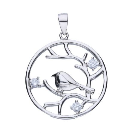 DURCHGEBRACHTER ANHÄNGER, 925 SILBER, RHODINIERT, WEISSER ZIRKONIA, DURCHMESSER 2,3 CM, NACHTIGALL, VOGEL.