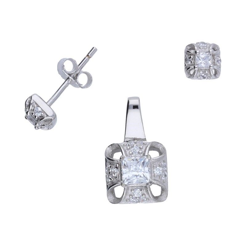 SET ANHÄNGER PLUS STAFF-OHRRINGE, 925 SILBER RHODINIERT, WEISSER ZIRKONIA, DURCHGEBRACHTE QUADRATE, ANHÄNGERABMESSUNGEN OHNE BAND 9 mm x 9 mm.