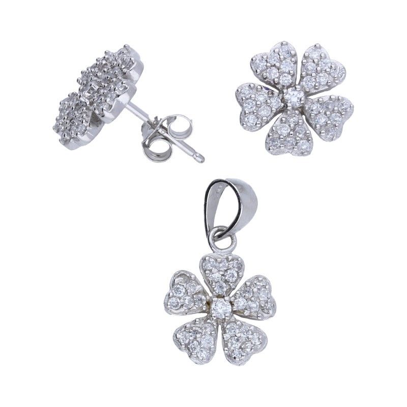 SET, ANHÄNGER PLUS OHRSTECKER, 925 SILBER RHODINIERT, WEISSER ZIRKONIA, BLUMEN, ANHÄNGERABMESSUNGEN OHNE BAND 14 mm x 11 mm.