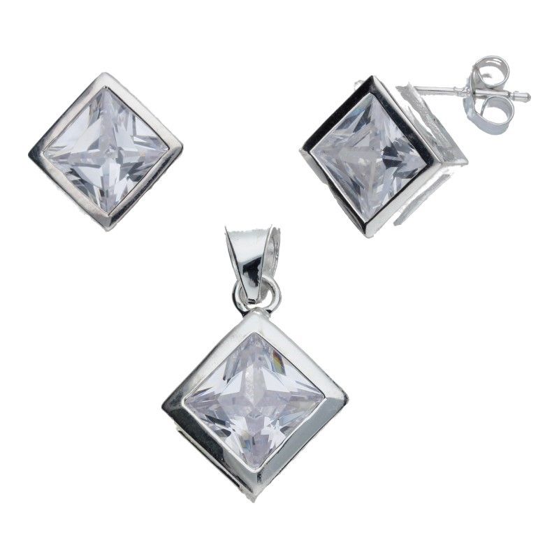QUADRATISCHES SET, ANHÄNGER PLUS STAB-OHRRINGE, 925 SILBER, OHRRINGGRÖSSE 1,0 cm x 1,0 cm, WEISSER ZIRKONIA.