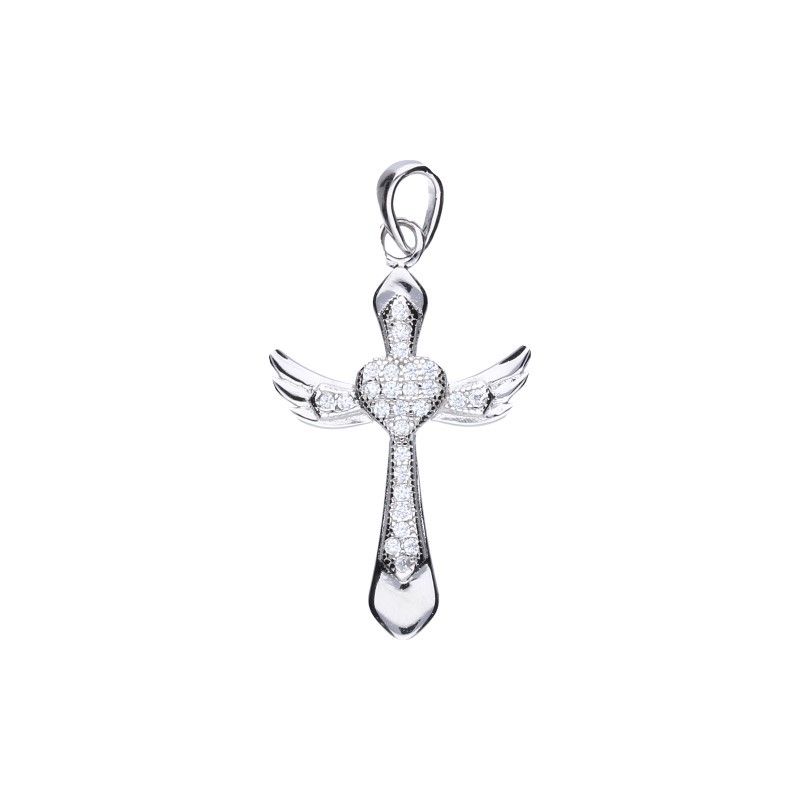KREUZFÖRMIGER ANHÄNGER, 925 SILBER, RHODINIERT, WEISSES ZIRKONIA, ABMESSUNGEN OHNE BAND 23 mm X 16 mm, HERZ, FLÜGEL.