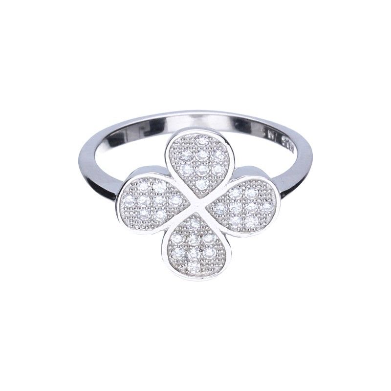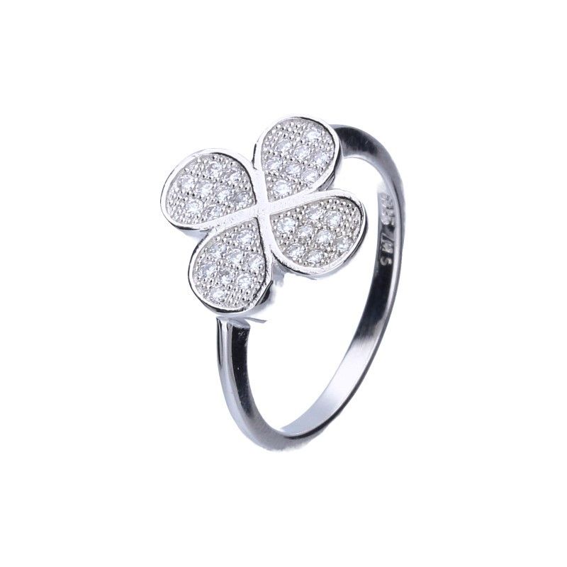 RING, 925er SILBER, RHODIUMBESCHICHTET, WEISSER ZIRKONIA, MIKROSETZUNG, KLEEBLATT, GRÖSSE 13 mm x 13 mm.