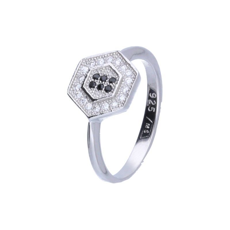 RING MIT GEOMETRISCHEM MOTIV, 925 SILBER, RHODIUMBESCHICHTET, SCHWARZ-WEIßES ZIRKONIA, MIKROSETZUNG, ABMESSUNGEN 9 mm x 11 mm.