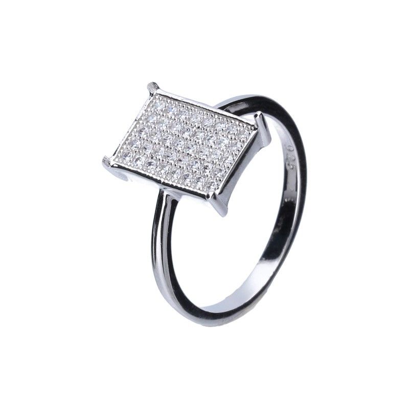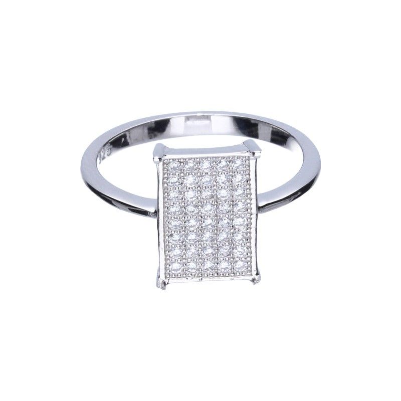 GEOMETRISCHER RING, 925 SILBER, RHODIUMBESCHICHTET, WEISSES ZIRKONIA, MIKROSETZUNG, RECHTECK, 9 mm X 11 mm.