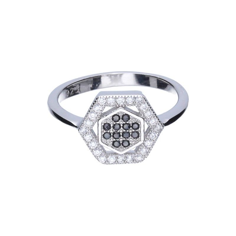 GEOMETRISCHER RING, 925 SILBER RHODIUMBESCHICHTET, WEISSES UND SCHWARZES ZIRKONIA, MIKROSETZUNG, ELEMENTABMESSUNGEN 9 mm X 11 mm.