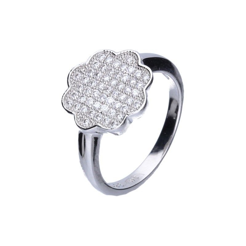 RING, 925er SILBER, RHODIUMBESCHICHTET, WEISSER ZIRKONIA, MIKROSETZUNG, BLUME, GRÖSSE 12 mm x 13 mm.