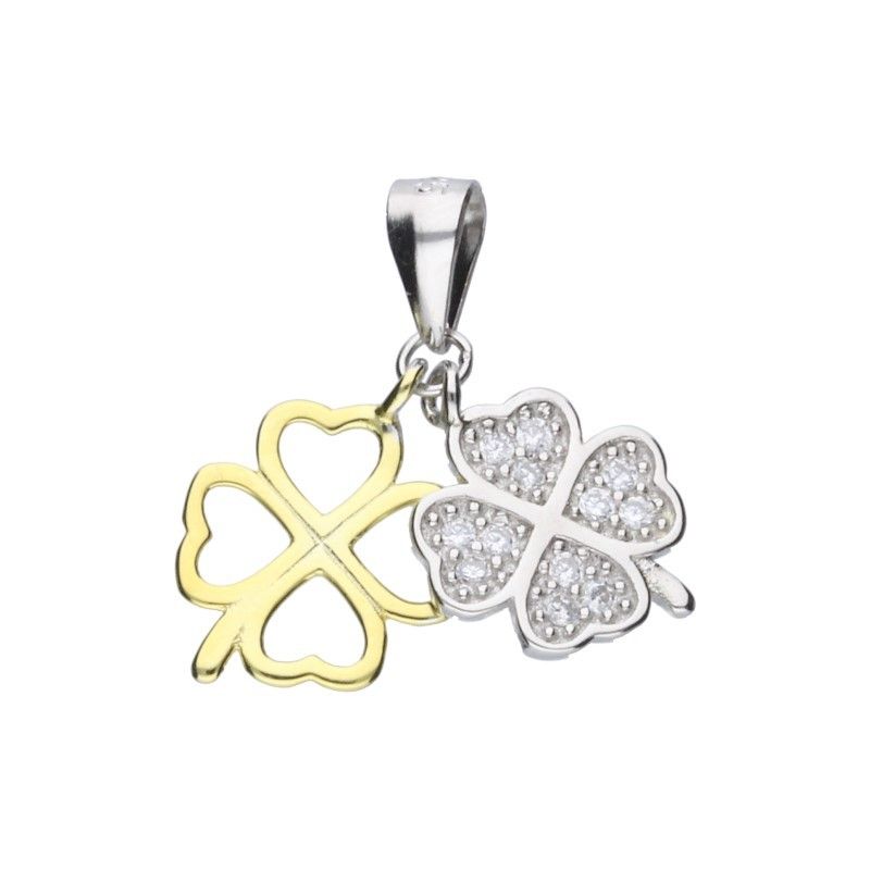 DOPPELANHÄNGER, KOMBINATION AUS 925ER SILBER, RHODINIERT MIT 24 KARAT VERGOLDET, WEISSEM ZIRKONIA, KLEEBLATT MIT ABMESSUNGEN VON 11 mm X 11 mm UND 10 mm X 10 mm.