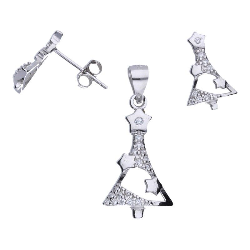 ZARTES SET AUS OHRSTECKER UND ANHÄNGER, 925 SILBER, RHODINIERT, WEISSER ZIRKONIA, WEIHNACHTSMOTIVE, WEIHNACHTSBAUM, STERNE.