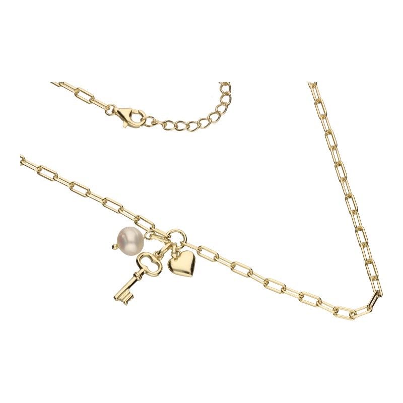 HALSKETTE, 925 SILBER, VERGOLDET, LÄNGE 42 cm + 3 cm VERLÄNGERUNG, PERLE, SCHLÜSSEL, HERZ, SILBERGEWICHT 4,9 G.