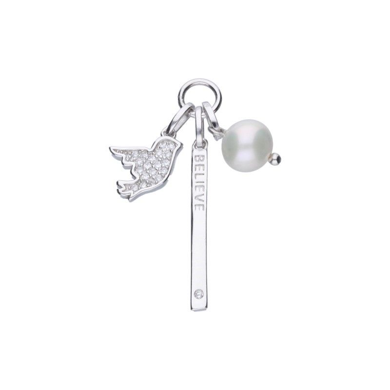 ANHÄNGER MIT DREI ELEMENTEN, 925 SILBER, RHODINIERT, WEISSER ZIRKONIA, PERLE 6mm DURCHMESSER, VOGEL 10mm X 8mm, PLATTE MIT DER INSCHRIFT BELIEVE 20mm X 2mm.