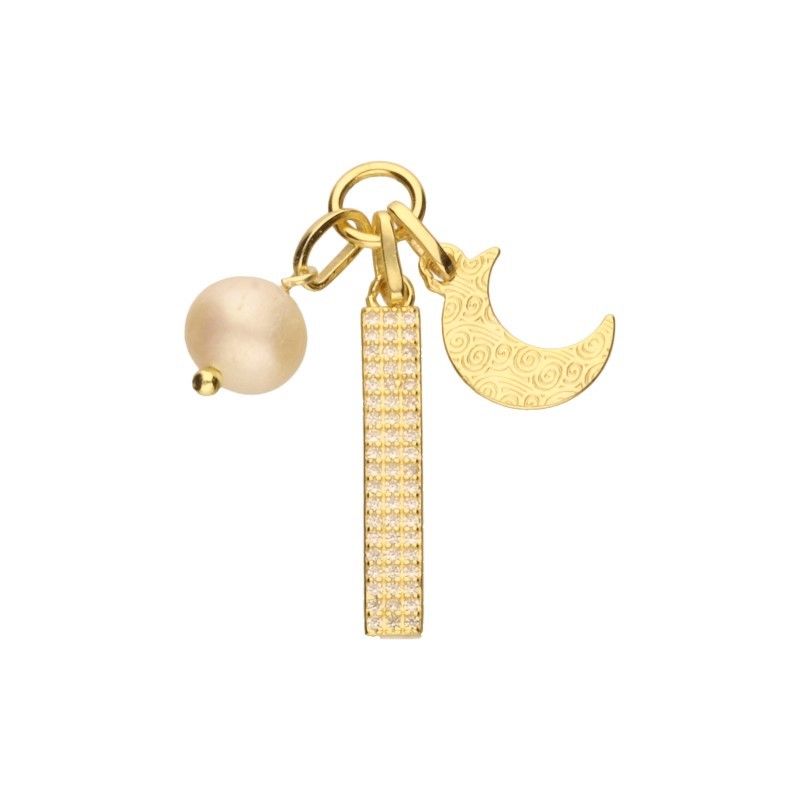 ANHÄNGER MIT DREI ELEMENTEN, 925 SILBER VERGOLDET MIT 24 KARAT GOLD, WEISSER ZIRKONIA, PERLENDURCHMESSER 6 mm, MOND 10 mm X 8 mm, PLATTE 18 mm X 3 mm.