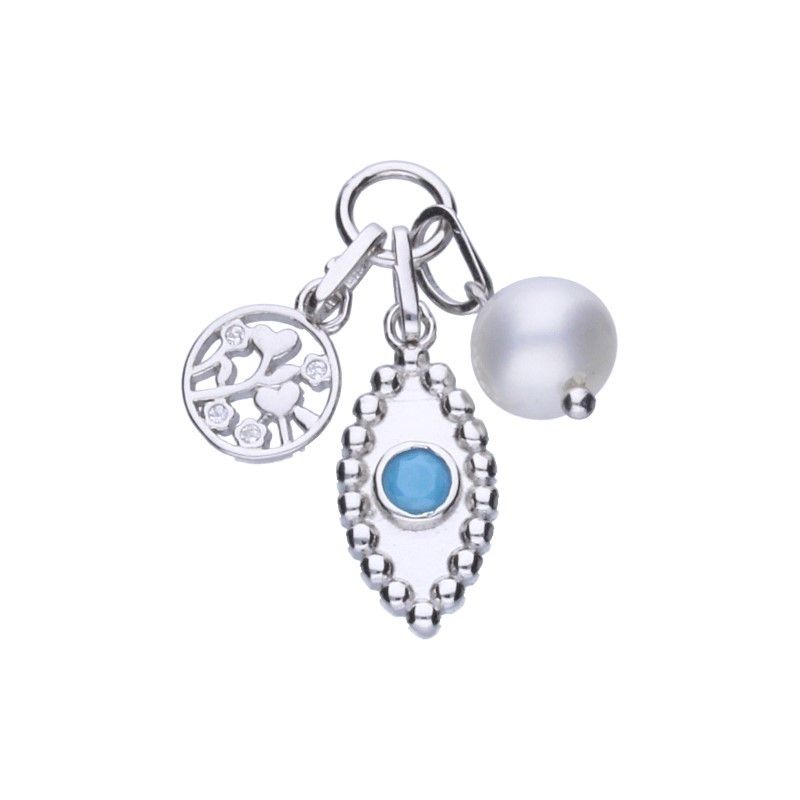 ANHÄNGER MIT DREI ELEMENTEN, 925 SILBER, RHODINIERT, WEISSER ZIRKONIA, TÜRKIS, PERLENDURCHMESSER 6 mm, AUGE 13 mm X 7 mm, DURCHGEBRACHTER LEBENSBAUM DURCHMESSER 8 mm, HERZEN.